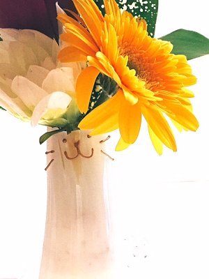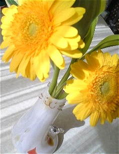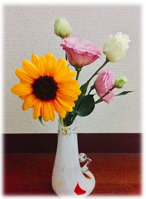 6回目の日がやってっきたね。しかも、命日の日曜日にぴったり。 シロさんのパズラー振りは健在ね。 お花は、いつもはベランダで育てている花だけど、 今日は先日の結婚記念日に相棒さんが送ってくれたお花を飾ろうね。 黄色いお花、シロさんに似合うよ。 くんくん、やってみて。 ひまわりだよ。 |