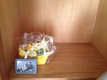 ![]() シロさん、今日はね、私達の結婚記念日なんだよ。 相棒さんが綺麗な花束をくれたので、シロさんにもお裾分け、飾ってあげようね。 3日後はシロさんの8回目の命日。 少し早いけど、お花はこれでいいかな? 綺麗でしょう?シロさんに似合ってる。 命日の日は何かおいしいものを一緒に食べようね。用意しようね。 |