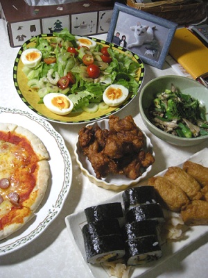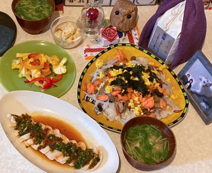 ![]() 16年目だなんて本当〜? はやいね。 まだシロさんがいるみたい。 焼き鮭をのせた ちらし を作りました。 お味噌汁はつみれ汁。 おなかいっぱい食べてくれたかな? 随分寒くなってきたから、シロさんも冷えないように気をつけてね。 |