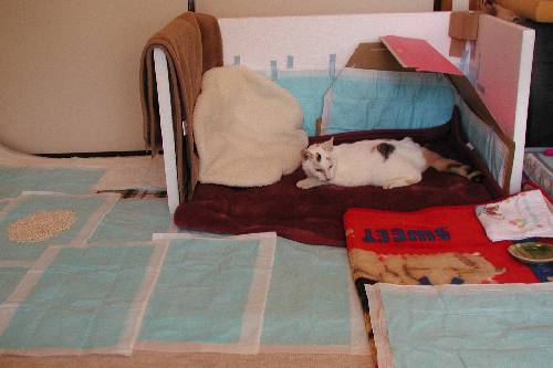 もう丸くなることができないので、囲いのある広いスペースがいいと思う。ばっちりだね。 |
