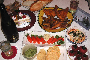 チーズクッキーの特製アボガドソース添え(*)、バケット、カットケーキ3種、スパークリングワイン。(*)の4種は先日キューピー3分クッキングで紹介していたオードブルだ。3分なんて無理難題、1時間はかかったよ〜。どれも美味しくて◎。シロさんはテーブルに上る事は1度もなかったけど、今夜は乗ってみてよ。一緒にご馳走を食べようよ。 |